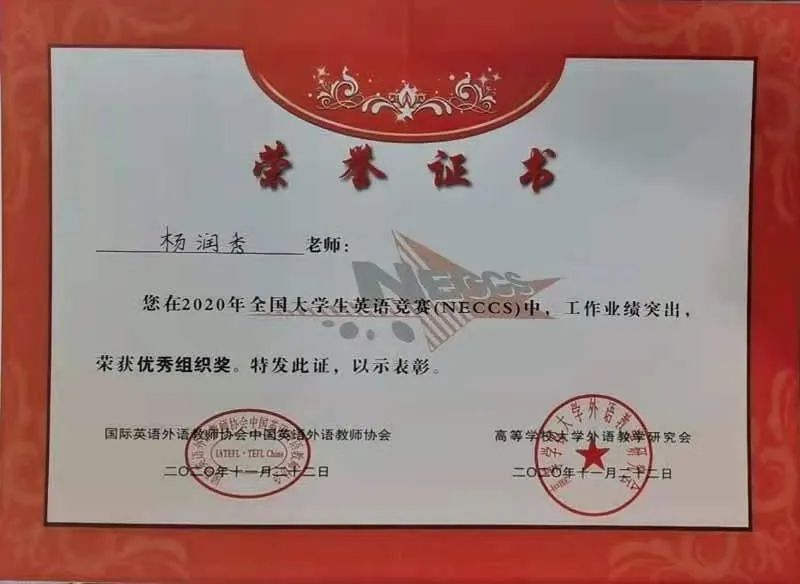best365副院长杨润秀教授在高等学校大学外语教学研究会主办的2020年全国大学生英语竞赛中(NECCS)中,工作业绩突出,荣获优秀组织奖,特此祝贺!