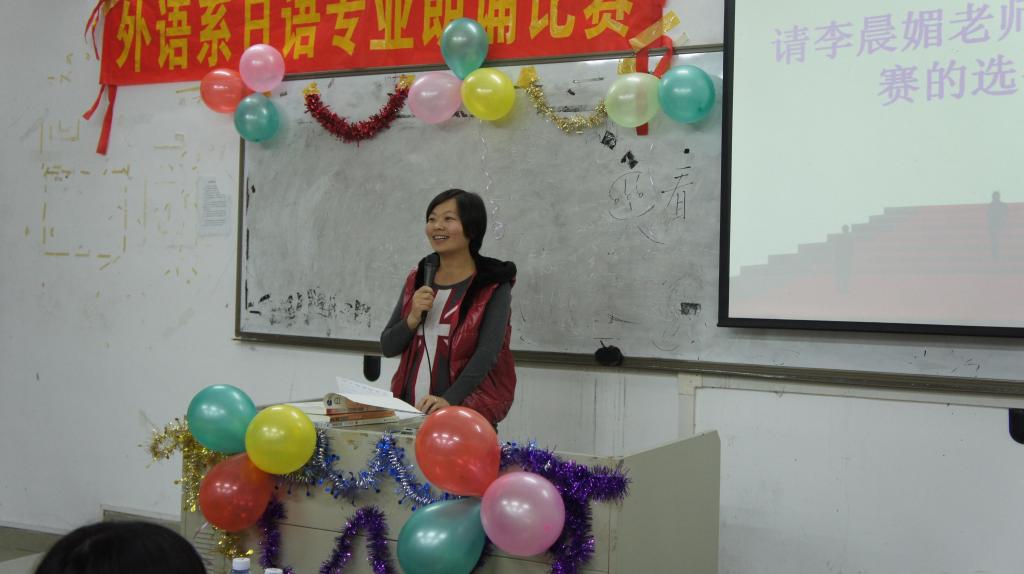 为了锻炼并检测日语班学生的日语表达能力、自我展现能力、综合素质能力以及创造一种学习日语的良好氛围,使同学们在口说日语中思考,在思考日语中进步,外语系日语教研室于2013112918点,在创新楼101举行了日语朗诵比赛初赛。出席本次比赛的有日语教研室主任李晨媚老师及其他日语教研室老师,还有79位大一至大三的日语班参赛选手和多位学生观众。