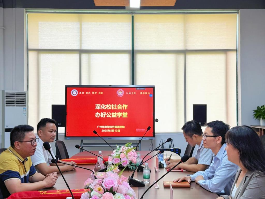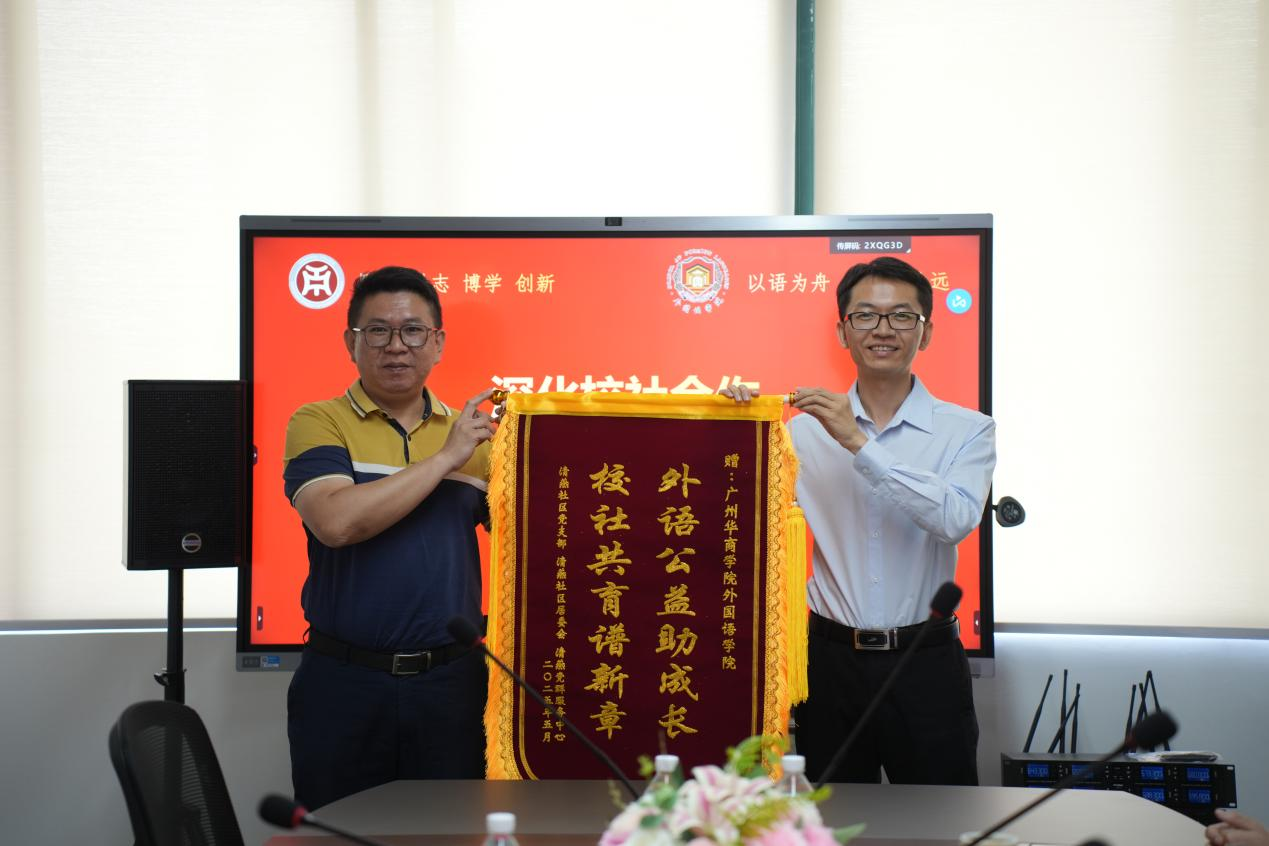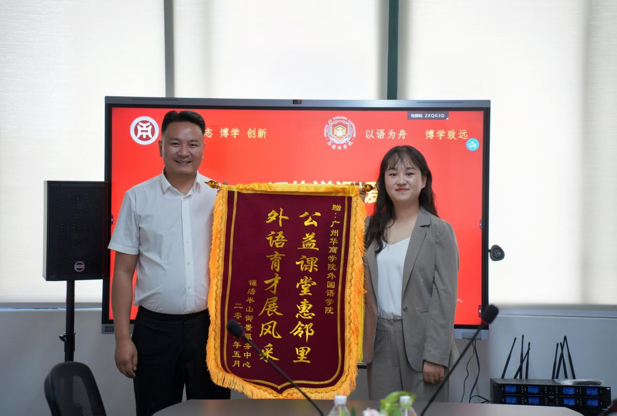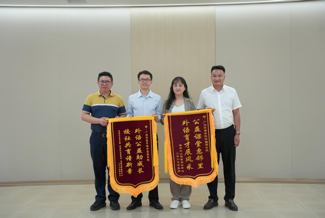 5月13日上午,best365中国官方网站与增城区清燕社区、锦绣半山御景花园小区物业联合举办的“晚风学堂”英语晚辅公益项目赠锦旗仪式在创新楼403-2小会议室举行。清燕社区邓镜波书记、锦绣半山御景花园小区物业陈勇经理、best365中国官方网站何顺发副院长及“晚风学堂”项目组全体成员共同见证这一校社协同育人的温暖时刻。“晚风学堂”不仅体现了外院学子践行社会责任的热忱,更是校社双向奔赴、共筑教育公益新模式的生动缩影。