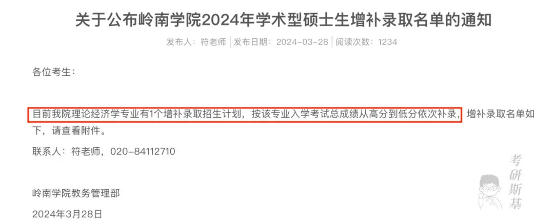 岭南学院理论经济学专业有1个增补录取招生计划,按该专业入学考试总成绩从高分到低分依次补录。