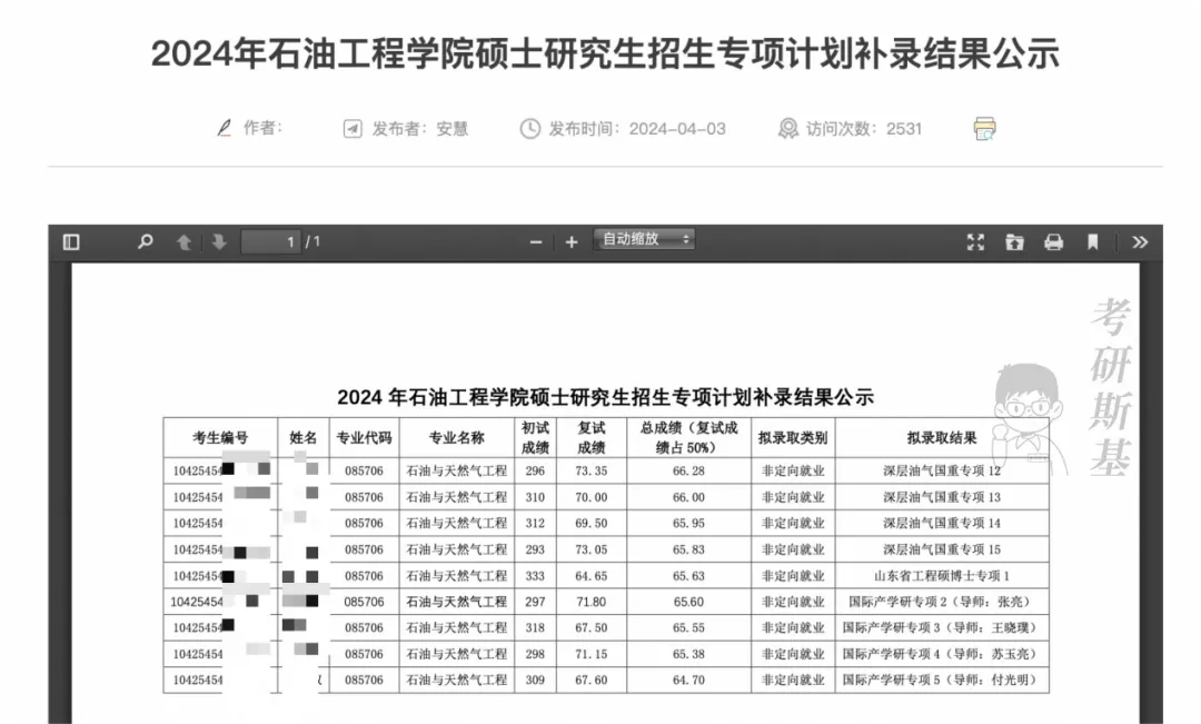 石油工程学院公布了2024年硕士研究生招生专项计划补录通知,共有9名石油与天然气工程专业的同学被补录成功。
