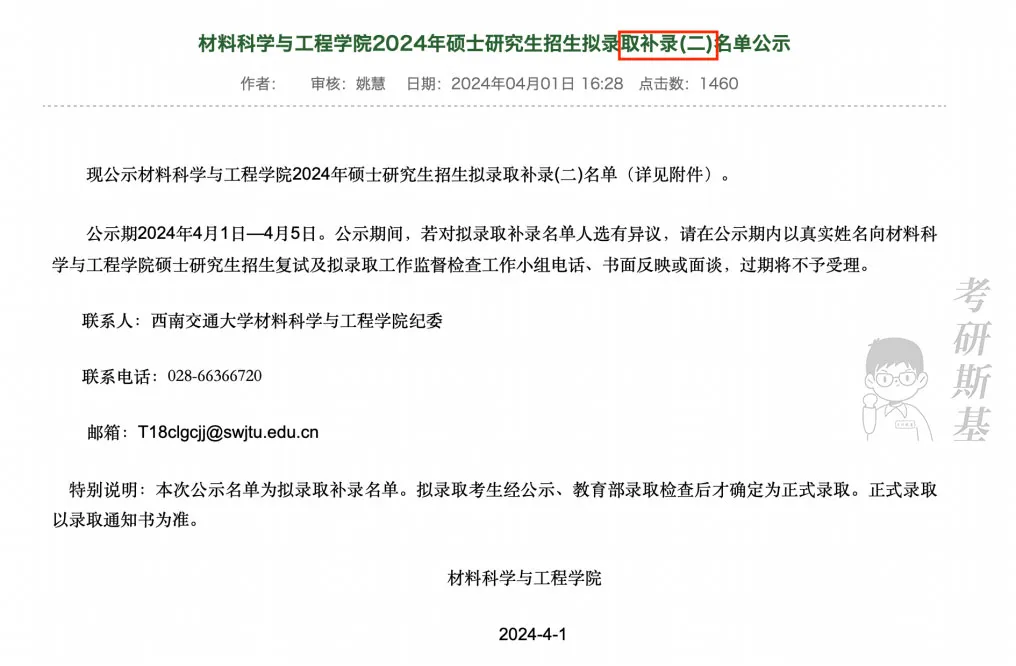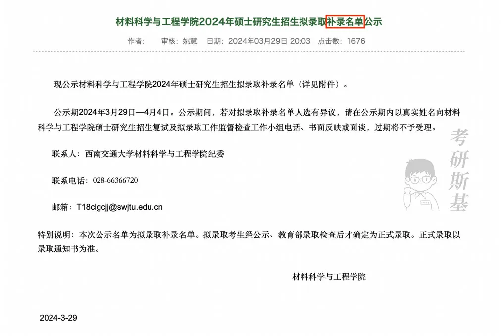 材料科学与工程学院材料与化工专业分别于03月29日和4月1日补录取6名和3名同学。
