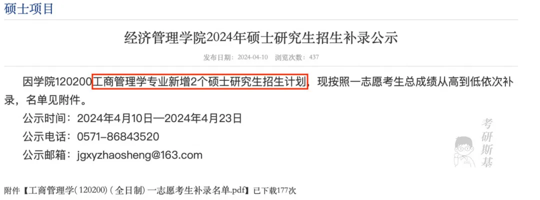 经济管理学院120200工商管理学专业由于新增2个硕士研究生招生计划,按照一志愿考生总成绩从高到低依次补录。