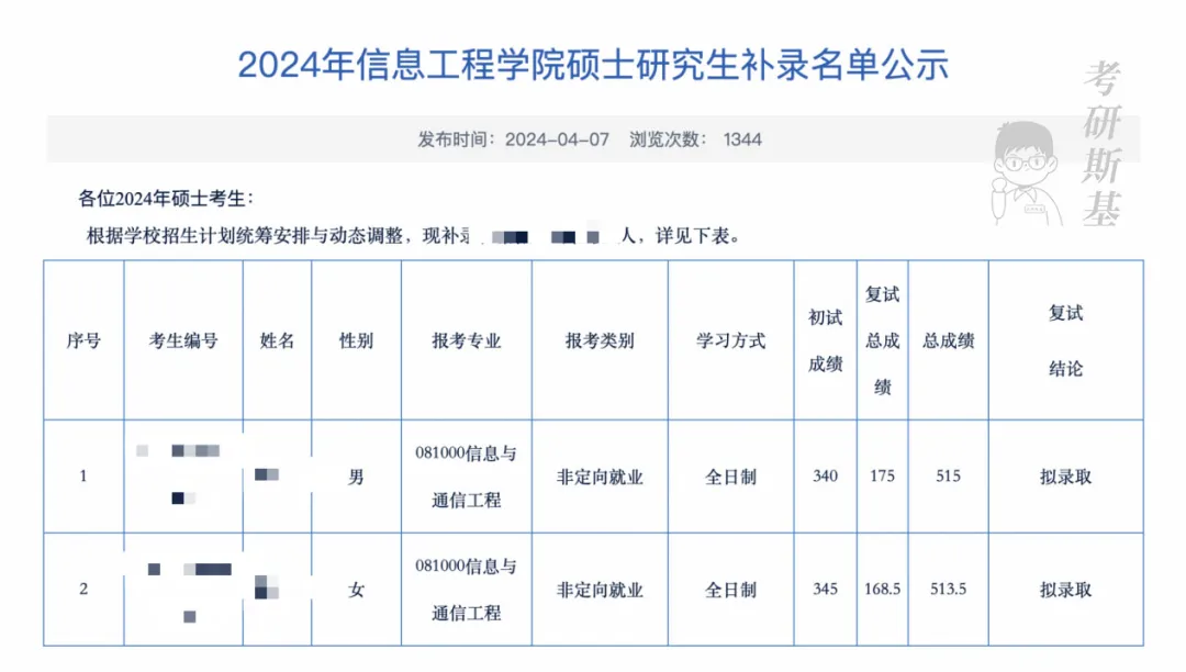 信息工程学院发布硕士研究生补录名单公示,根据学校招生计划统筹安排与动态调整,现补录信息与通信工程专业2名同学。