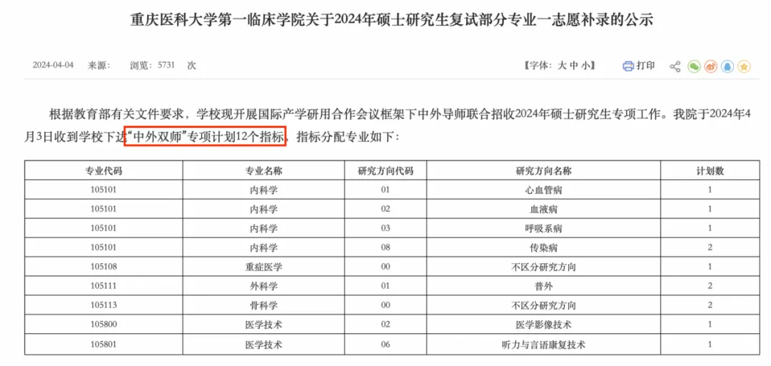 第一临床学院于2024年4月3日收到学校下达“中外双师”专项计划12个指标,将从计划指标所在专业一志愿候补未被录取考生中按总成绩由高到低进行补录。
