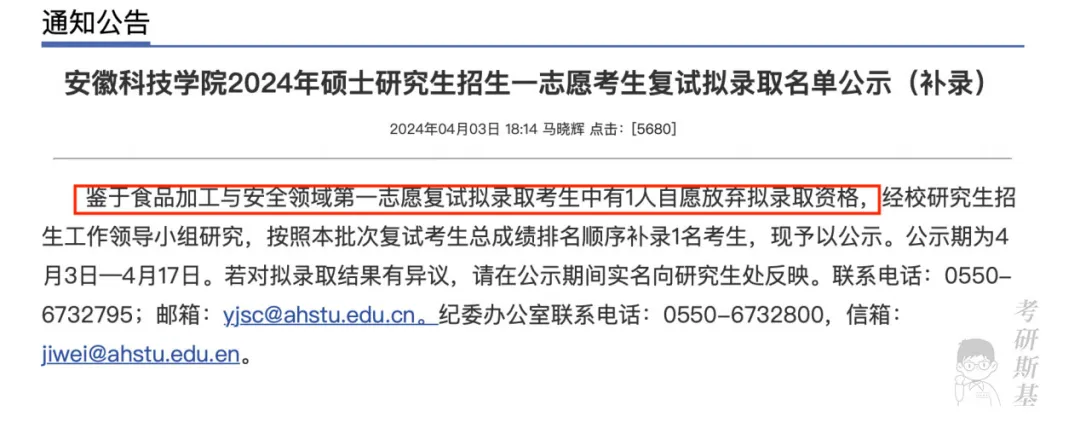 鉴于食品加工与安全领域第一志愿复试拟录取考生中有1人自愿放弃拟录取资格,经校研究生招生工作领导小组研究,按照本批次复试考生总成绩排名顺序补录1名考生。