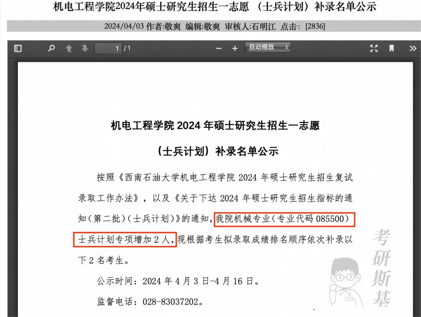 机电工程学院机械专业(专业代码085500)士兵计划专项增加2人,根据考生拟录取成绩排名顺序依次补录2名考生。